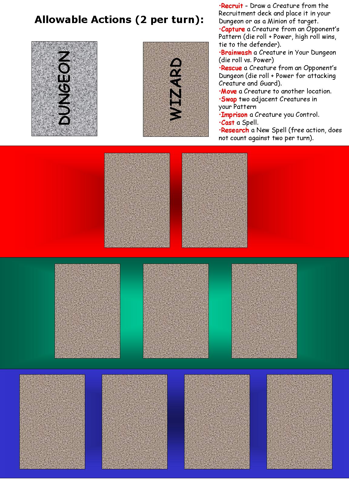 Each player has a pattern and a dungeon. The top level of the pattern is occupied by the player’s wizard card, with each wizard associated with a specific clan of creatures. The pattern builds down from there, with each card having up to two minions. If a player gets a total of ten cards in their pattern, they win the game. The dungeon is where players keep creatures they don’t want, as well as their spell components and creatures stolen from other players. Dungeons can be raided by other players, and must be guarded and used carefully.