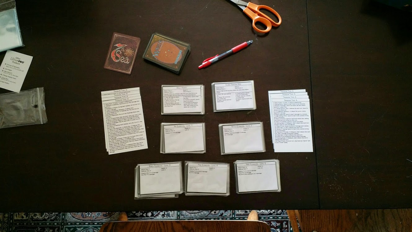 That work is done, at least for now. I printed things up, cut out some cards, stuck on some sleeves, and at last had a second stage prototype. It was time to get some table time with other folks.